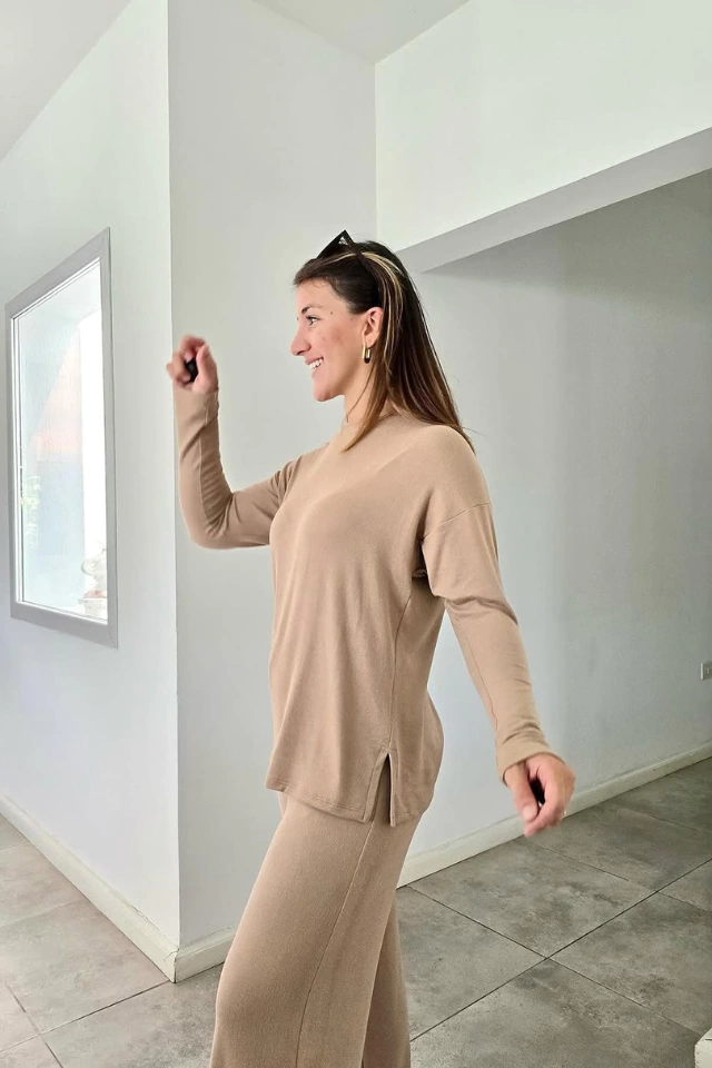 - Sweater amplio y largo. Manga caída. Tajitos en los laterales. Cuello bote.