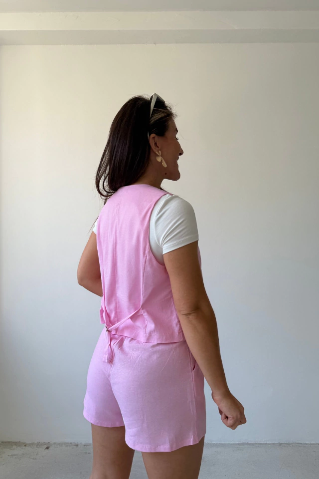 Este dúo está confeccionado en lino sastrero de alta calidad para que disfrutes de la comodidad sin perder estilo. El Chaleco realza tu figura con su pinzado delicado y lazo ajustable en la espalda, mientras que el Short sastrero completa el conjunto con un calce perfecto gracias a su elástico trasero, brindándote amplitud y libertad de movimiento.