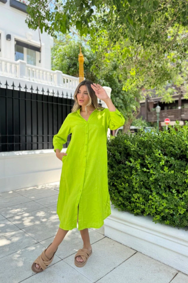 Especificaciones del producto: - 1 Vestido Largo Camisero de Lino Color Verde Manzana