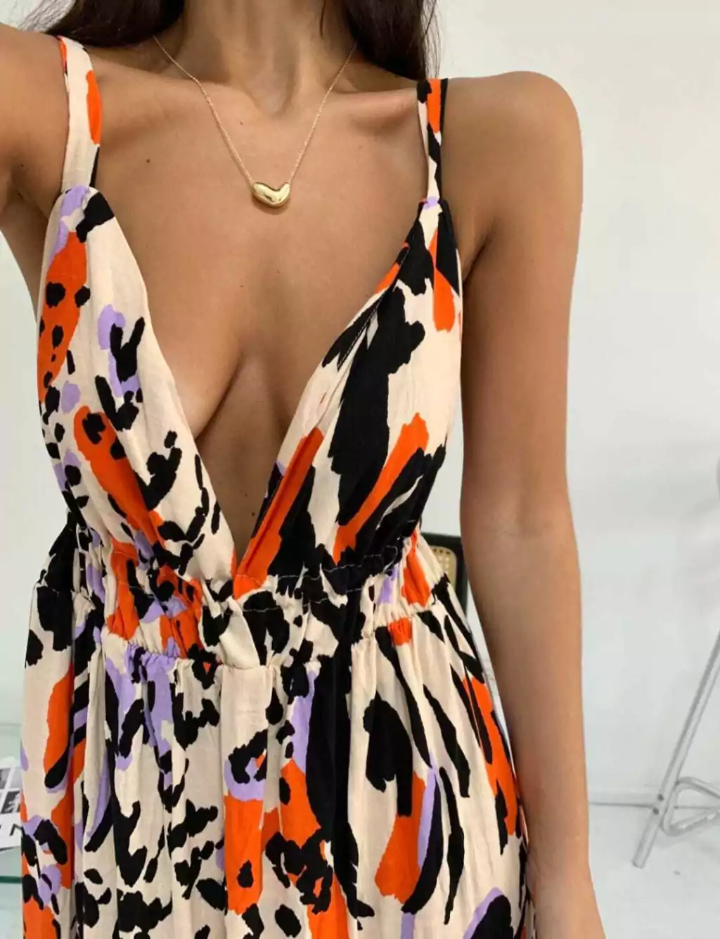 Déjate cautivar por este impresionante vestido largo con estampado abstracto .escote profundo en V, tirantes ajustables y variedad de tonos.